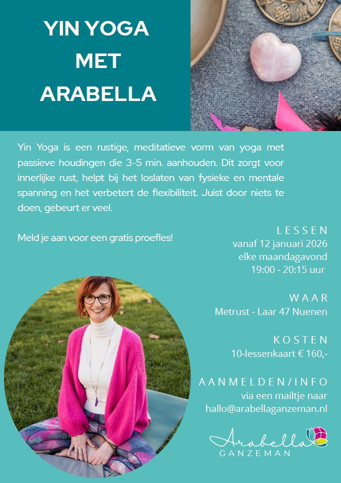 Yin Yoga met Arabelle Geplaatst op 23 november 2025 door marjolijn In het nieuwe jaar zullen er bij Metrust op maandagavond Yin Yoga lessen gegeven worden door Arabella. Heb je interesse mail dan rechtstreeks met Arabella: hallo@arabellaganzeman.nl